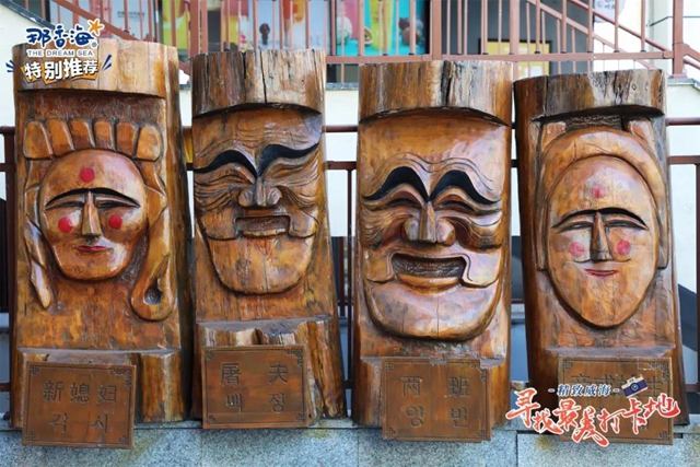 ????韓國的國寶河回假面在樓梯旁矗立,與人同高的雕塑上,印著不同妝容的假面。雕塑的底部,分別刻著不同假面人物的身份介紹。于是,我們便能看到羞怯的新媳婦、巧言厲色的兩班等。除了河回假面外,在不同地段,還有被視作守護神的長丞。