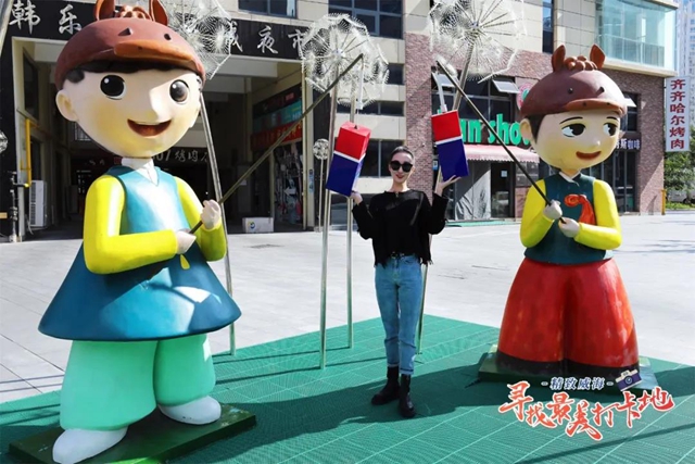 ????入口處的大門名為麗水門,瓦片為韓國麗水市捐獻,每片瓦上均有栩栩如生的木槿花圖案。門外的石碑上,印著麗水門碑文和中韓友好城市的名錄。進入街頭,寓意和平、友好的“手拉手”雕塑便映入眼簾。