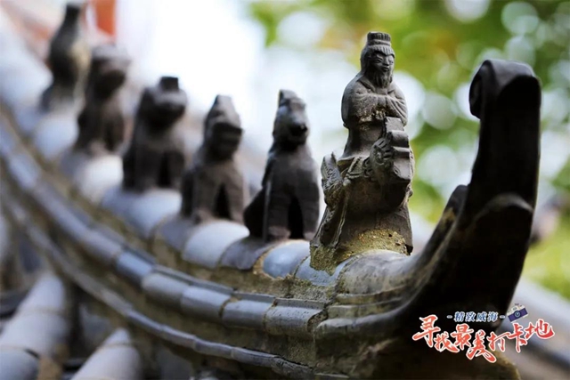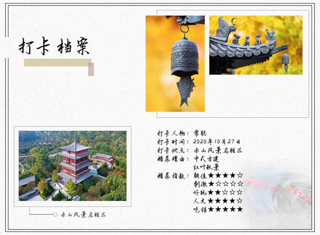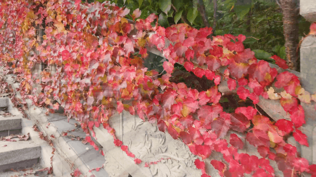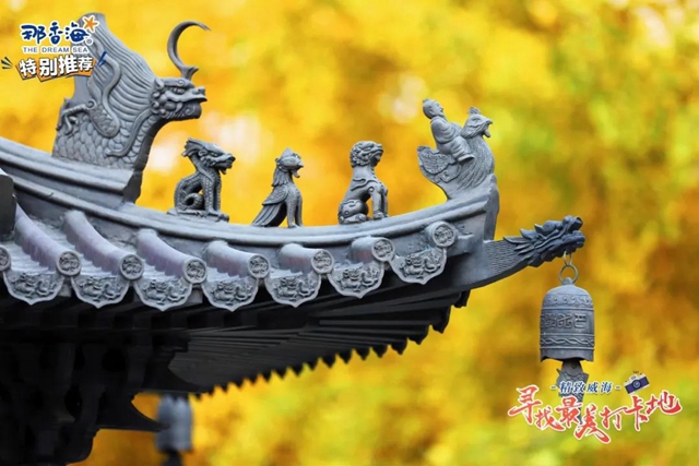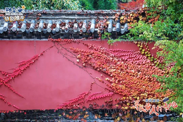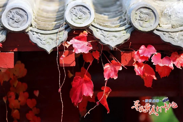 ????秋天是最為詩(shī)意的季節(jié),秋天的赤山,扇狀的黃葉渲染出秋意,紅色的爬山虎繞上印著龍圖騰的瓦片,大風(fēng)吹來(lái),楓葉就簌簌落滿一地。