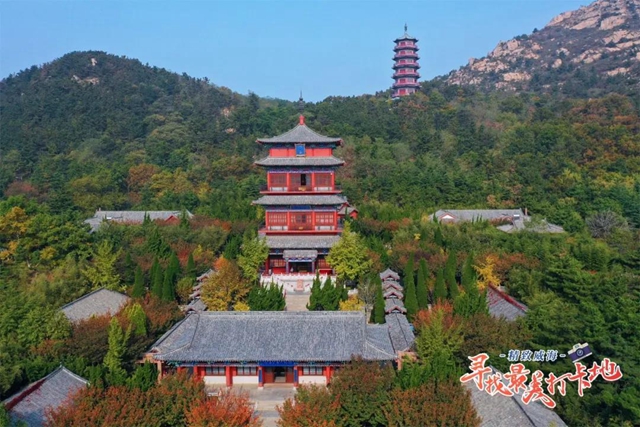 ????赤山的秋色是叫人眼花繚亂的,但也帶了些虛實(shí)結(jié)合的美。漫山叢林中,幾殿宮宇分散矗立,高塔從大片的綠林中探出頭來(lái),留了些引人無(wú)限遐想的空間。