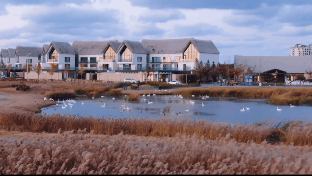 ????走進那香海·天鵝湖度假小鎮的一瞬間,像是走進了童話世界。現代海草房錯落有致,屋后是大片墨綠色的松林,房前是優雅的天鵝湖,大天鵝們在這里棲息,一切都是安靜美好的樣子。