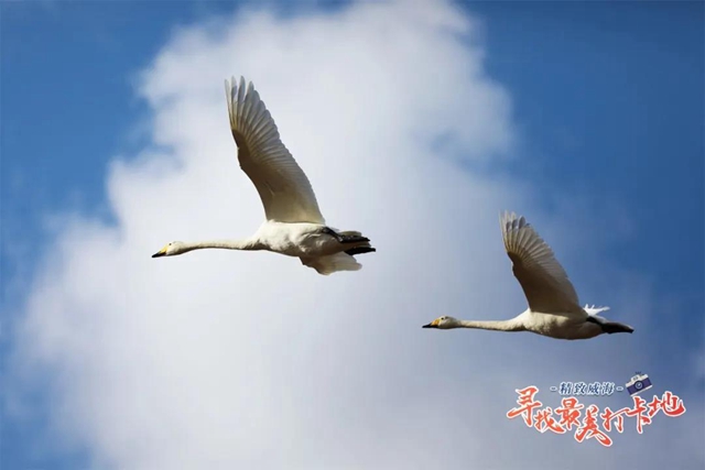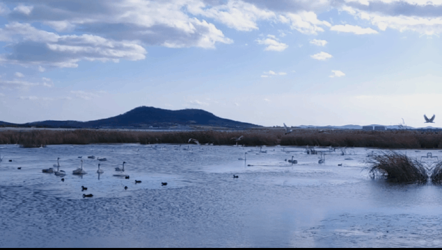 ????遠山近水間,這片土地因為大天鵝的到來而充滿文藝浪漫的氣息。好像松林屏蔽掉了城市的汽笛聲,也好像大天鵝的優雅治愈了生活的焦慮,在這里的每一分鐘,都是一種享受。