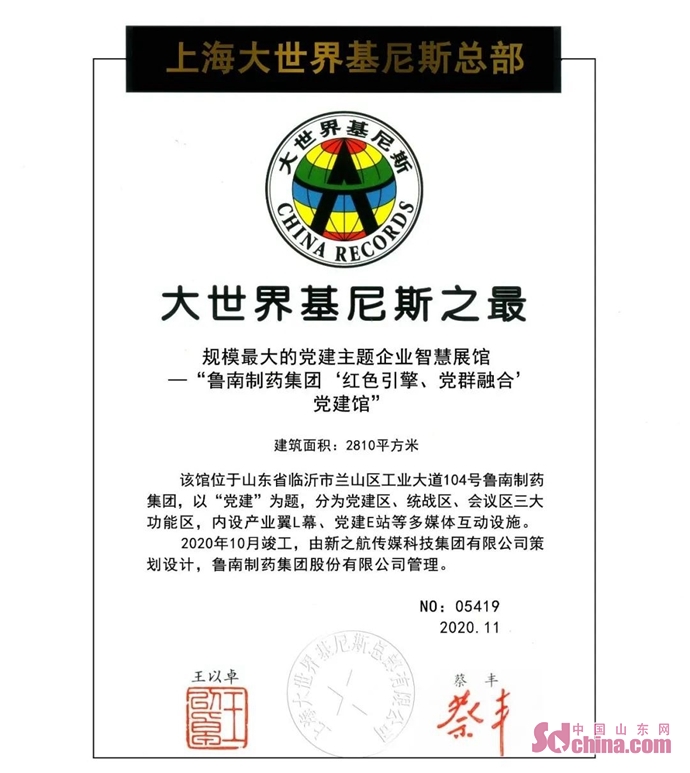??????11月10日,從上海大世界基尼斯總部傳來喜訊,由新之航策劃設計施工的魯南制藥集團“紅色引擎、黨群融合”黨建館獲“大世界基尼斯之最——規模最大的黨建主題企業智慧展館”認證!這是繼6月份時代楷模趙志全同志紀念館巨幅人像獲“最多瓶蓋組成的人像圖案”后新之航展館取得的又一項“世界之最”。