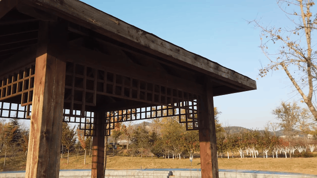 ????走累了就在木亭子里歇息一會,吹吹風(fēng)、曬曬暖陽,看著那輕盈起舞的落葉,耳畔響起那句“緩緩飄落的楓葉像思念,我點燃燭火溫暖歲末的秋天……”。