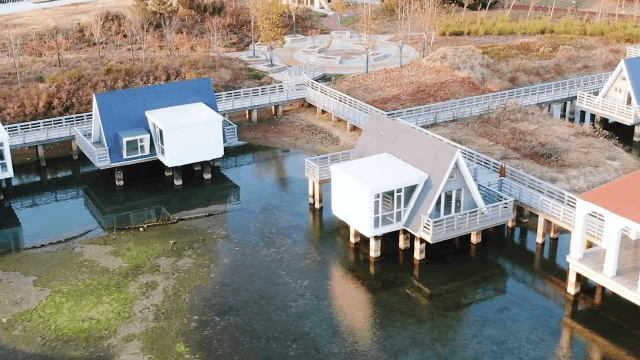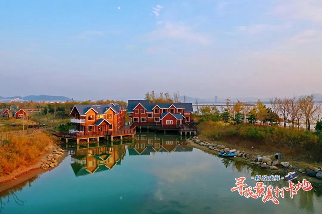 ????再往前有一片造型別致的水上建筑,紅頂白柱的亭子、藍頂棱柱狀的房子……頗有異域風(fēng)情,仿佛誤入圣托里尼。