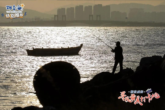 ????遠處有幾艘小漁船點綴在藍色的海面上,在海風(fēng)的吹拂下微微晃動。岸邊有海釣愛好者,在夕陽下盡情享受拋竿之樂,獨坐天地之間,仿佛萬千嘈雜與瑣碎,都隨著魚竿一拋而過,留下的只有純粹的享受。