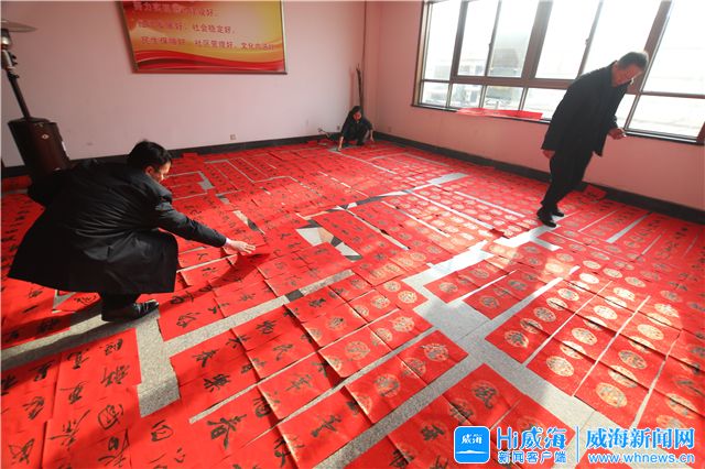 偌大的會議室里,這邊,來自我市的10余位書法家和書法愛好者揮毫潑墨,寫起了春聯和福字;那邊,來自省派“加強農場基層黨組織建設”工作隊和環翠區微力社會工作服務中心的工作人員出出進進,忙著將一副副寫好的春聯和一個個福字拿到大廳,攤開了晾曬。不一會兒工夫,整個大廳就被紅彤彤的春聯和福字鋪滿,放眼望去,甚是喜慶……10余位書法家和書法愛好者越寫熱情越高,他們脫下外套,擼起袖子,揮毫潑墨,每個人的臉上都洋溢著開心的笑容。忙碌中,大家時不時地交流著書法心得,點評著彼此的作品。
