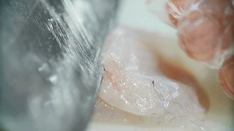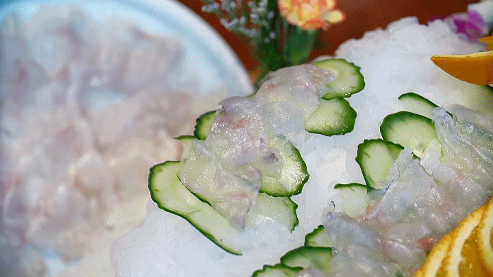 “河豚肉本身就有嚼勁”,于明剛師傅說(shuō)。若要完全品出河豚的鮮美,肉需得片得越薄越好,晶瑩剔透,筷子輕輕一提,乳白色的肉便能含著光,透進(jìn)眼里。