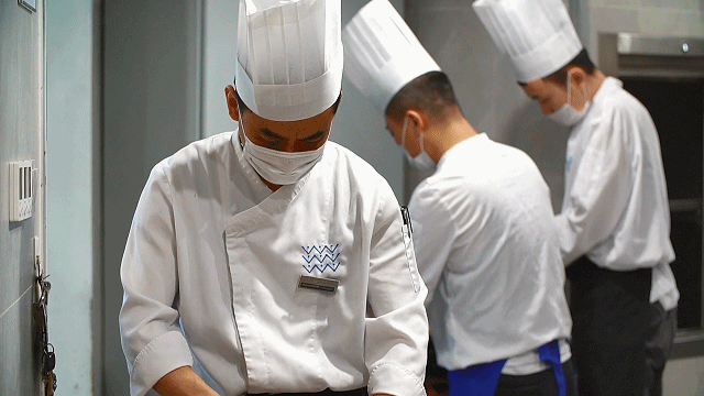 抱海大酒店里,于明剛師傅正在仔細(xì)片河豚肉。
