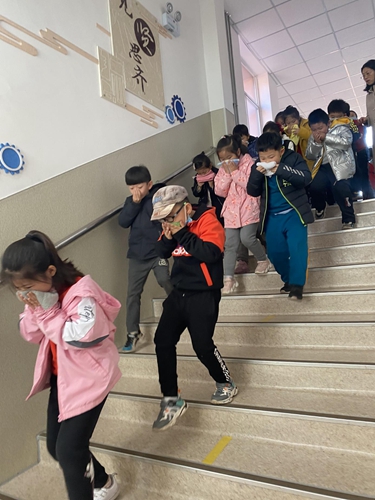 ????隨著防火警報響起,各位老師在指定崗位指導學生疏散,學生們彎著腰,用手絹捂住口鼻,沿著指定路線快速疏散到學校操場。隨即各班班主任清點人數,并向演練指揮報告。疏散完畢,年級校長對此次演練情況進行了點評和總結。