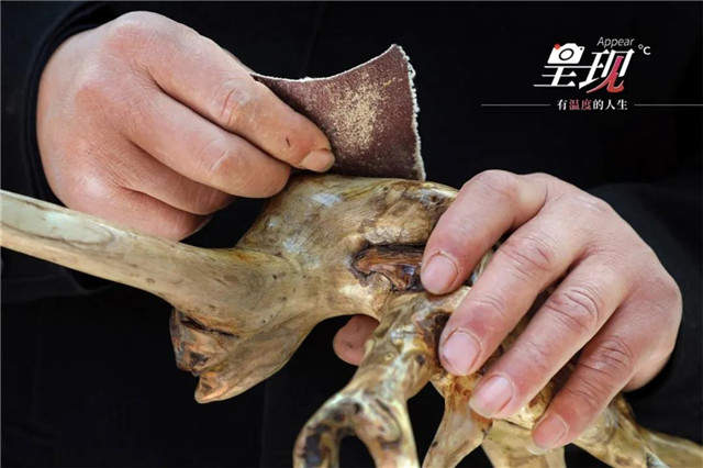 ??????一念之間,手起刀落。一個好的根雕手藝人,不是簡單的征服根木,而是既懂得順勢而為,留住根木天然的紋理與造型,又知道如何大刀闊斧地創作,正所謂“天缺人工補,人補天不足”。