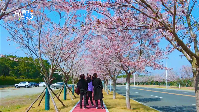 ??????位于經開區海悅路兩旁的櫻花迎來盛花期,粉粉嫩嫩的櫻花艷麗動人,一團團、一簇簇,白如雪、粉似霞。長長鋪開的“櫻花毯”,將整條海悅路裝點得春意盎然,引得不少市民駐足拍照。