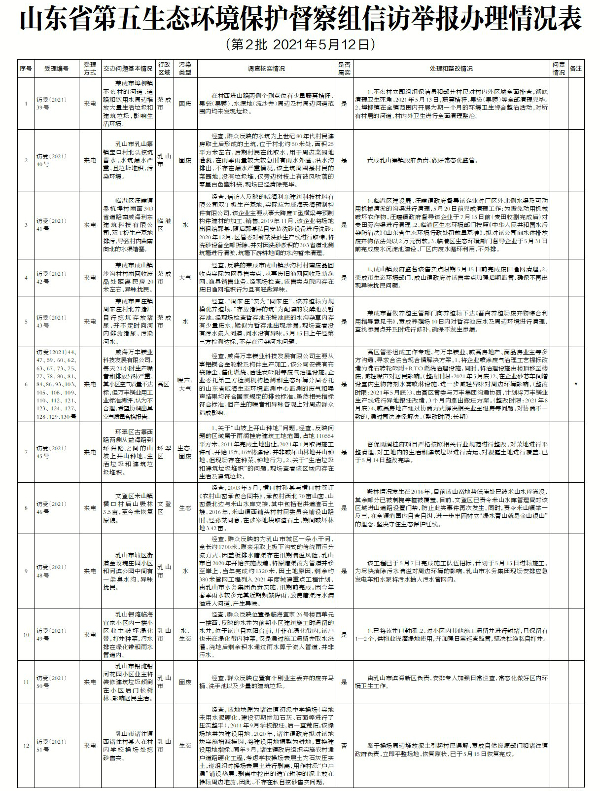山東省第五生態環境保護督察組向我市交辦第二批信訪件共計94件(重復件32件)。截至5月19日12時,已全部辦結。其中屬實89件(重復件32件),不屬實5件。