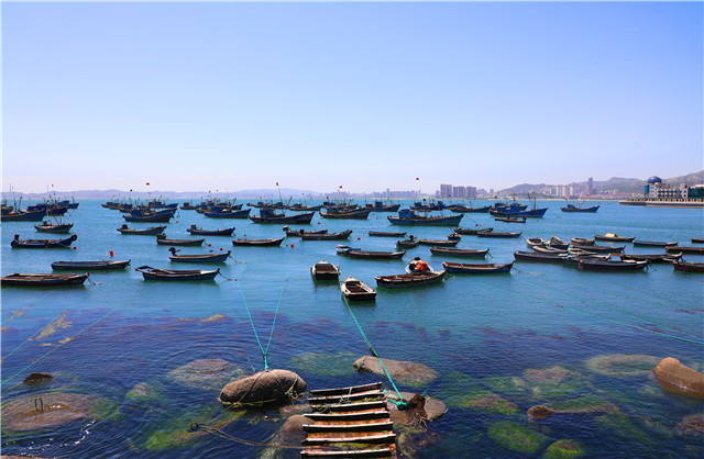 ??????因合慶碼頭距離市中心非常近,蔚藍的大海、停泊的漁船還與不遠處鱗次櫛比的高樓大廈構成了一幅美麗的“海市蜃樓”。