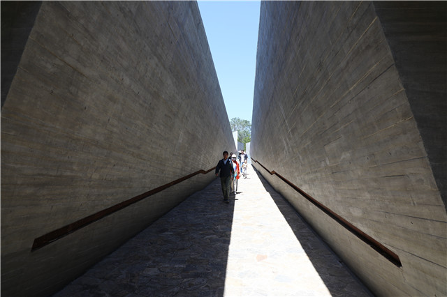 ??????一戰華工紀念館的出名,在于它特別的建筑風格,如它灰色的廊道、混凝土的墻體、深埋地下的建筑主體,以及十字造型。