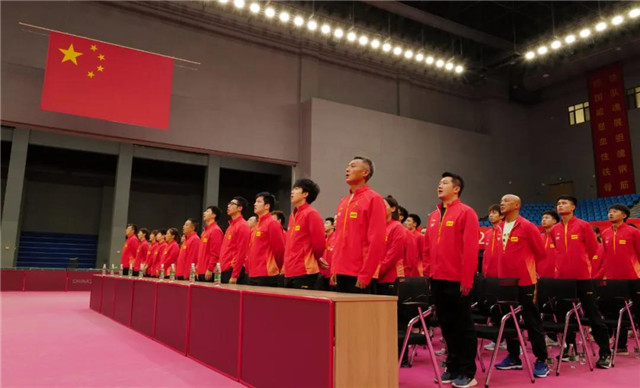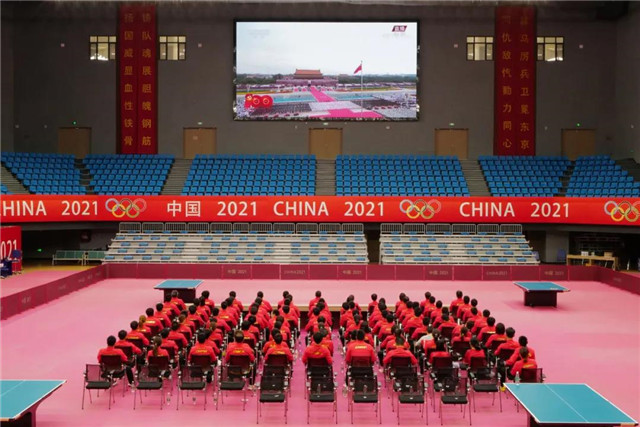 ??????7月1日,正在威海南海國家乒乓球訓練基地備戰東京奧運會的中國國家乒乓球隊,全體人員身著紅色領獎服,黨員佩戴黨徽,在黨旗和國旗下莊嚴列隊,集體觀看慶祝中國共產黨成立100周年大會。