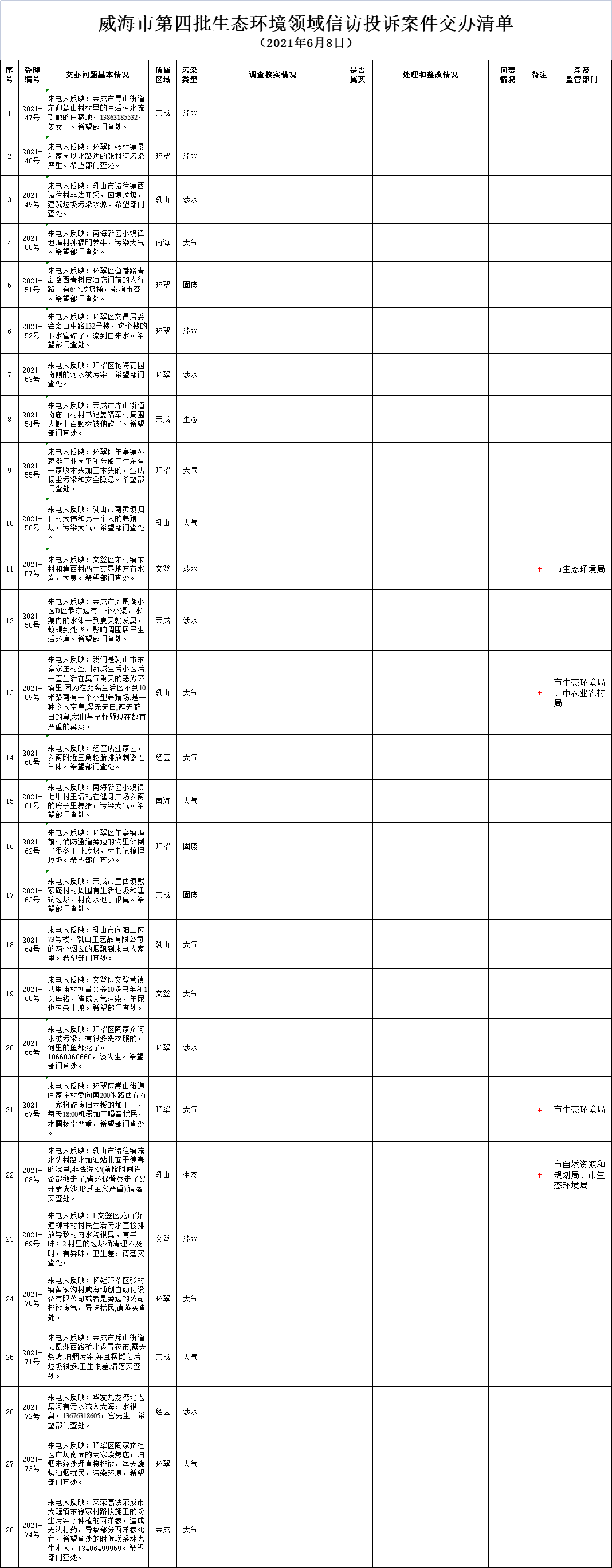 威海市第四批生態環境領域信訪投訴案件交辦清單共計28件。截至7月1日17時,已全部辦結。其中屬實23件,不屬實5件。