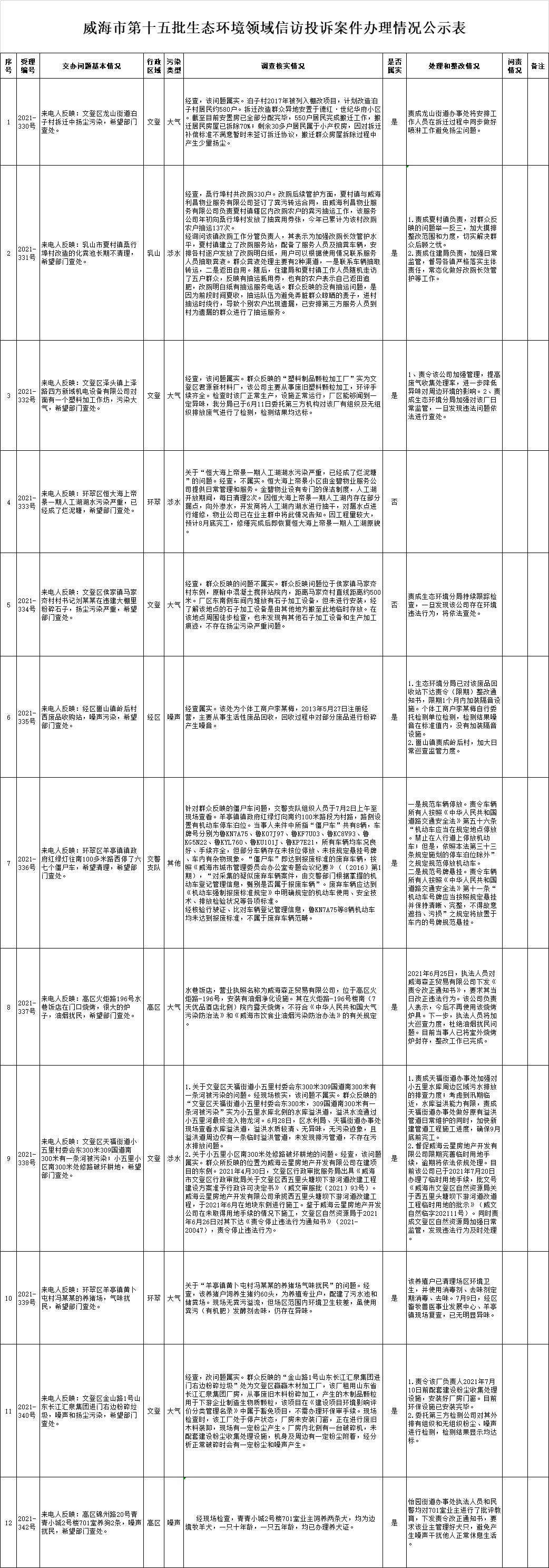 ??????威海市第十五批生態環境領域信訪投訴案件交辦清單共計13件。截至8月3日17時,已辦結12件。其中屬實10件,不屬實2件。