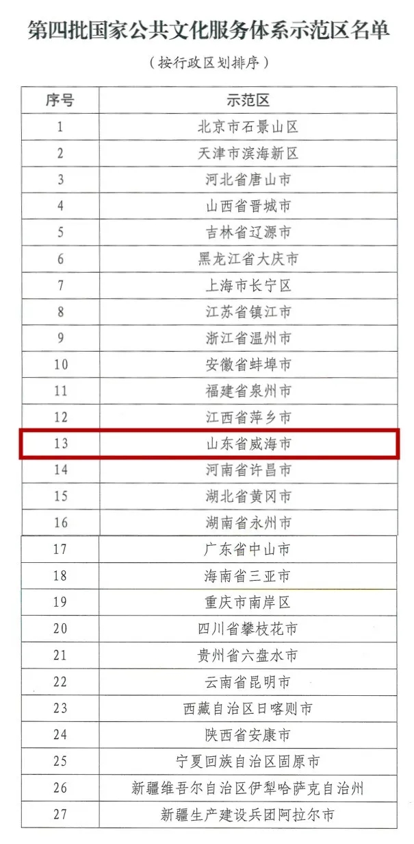 ??????近日,文化和旅游部發布了《文化和旅游部、財政部關于公布第四批國家公共文化服務體系示范區(項目)名單的通知》。27個市(區、州)被命名為國家公共文化服務體系示范區,47個項目被命名為國家公共文化服務體系示范項目名單。威海市成功入選第四批國家公共文化服務體系示范區名單。