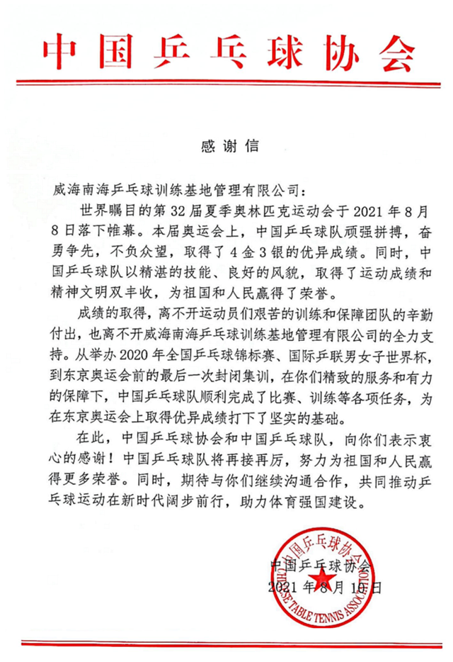 ??????8月8日,第32屆夏季奧林匹克運動會在東京落下帷幕。中國乒乓球隊在本屆奧運會上頑強拼搏,奮勇爭先,取得了4金3銀的優異成績,實現了運動成績與精神文明雙豐收?!俺煽兊娜〉茫x不開運動員們艱苦的訓練和保障團隊的辛勤付出,也離不開各單位的全力支持。”在《感謝信》,中國乒乓球協會對南海新區管委和威海南海乒乓球訓練基地對國乒隊集訓備戰的支持表示感謝。