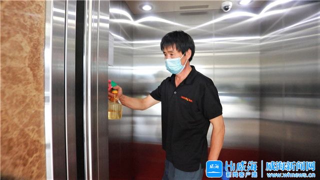 威海創(chuàng)新園職工為電梯消毒。Hi威海客戶端記者 朱春曉 攝