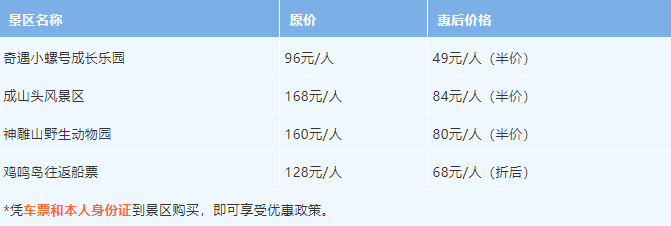 近日,奇遇小螺號成長樂園、成山頭風(fēng)景區(qū)、神雕山野生動物園、雞鳴島等景區(qū)還推出半價優(yōu)惠福利,不要錯過!*優(yōu)惠期限:自專線運營日至9月18日。