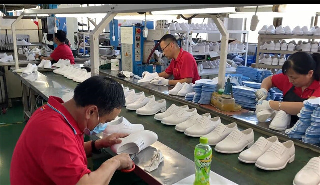 ??????沿生產線一路看過去,工人們的面孔有老有新,但他們的手法卻同樣熟練。一雙鞋需要120多道工序才能成型,與質量聯系最緊密的鉗幫、錘鞋、擂平等步驟,都會交給“人”來評判定奪,來保證最好的產品質量。