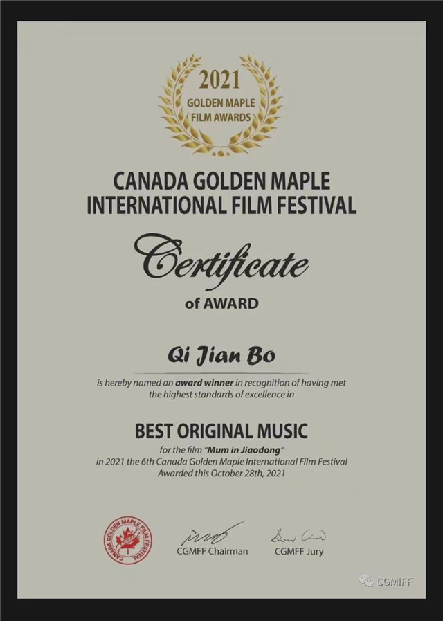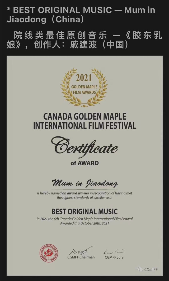 ??????11月5日,第六屆金楓葉國際電影節單項獎獲獎名單揭曉,影片《膠東乳娘》獲院線類最佳影片、院線類最佳原創音樂兩項大獎,其中獲獎的原創音樂由戚建波創作。