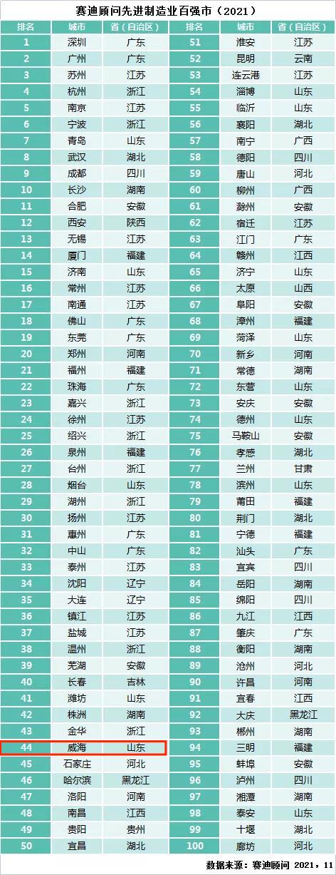 ??????11月29日,工業和信息化部直屬單位賽迪研究院賽迪顧問發布《先進制造業百強市(2021)》,通過創新能力、融合發展、經濟帶動、品牌質量和綠色集約五個維度27項指標,對全國293個地級市的先進制造業發展情況進行系統研究和綜合評估。威海市位列第44名。