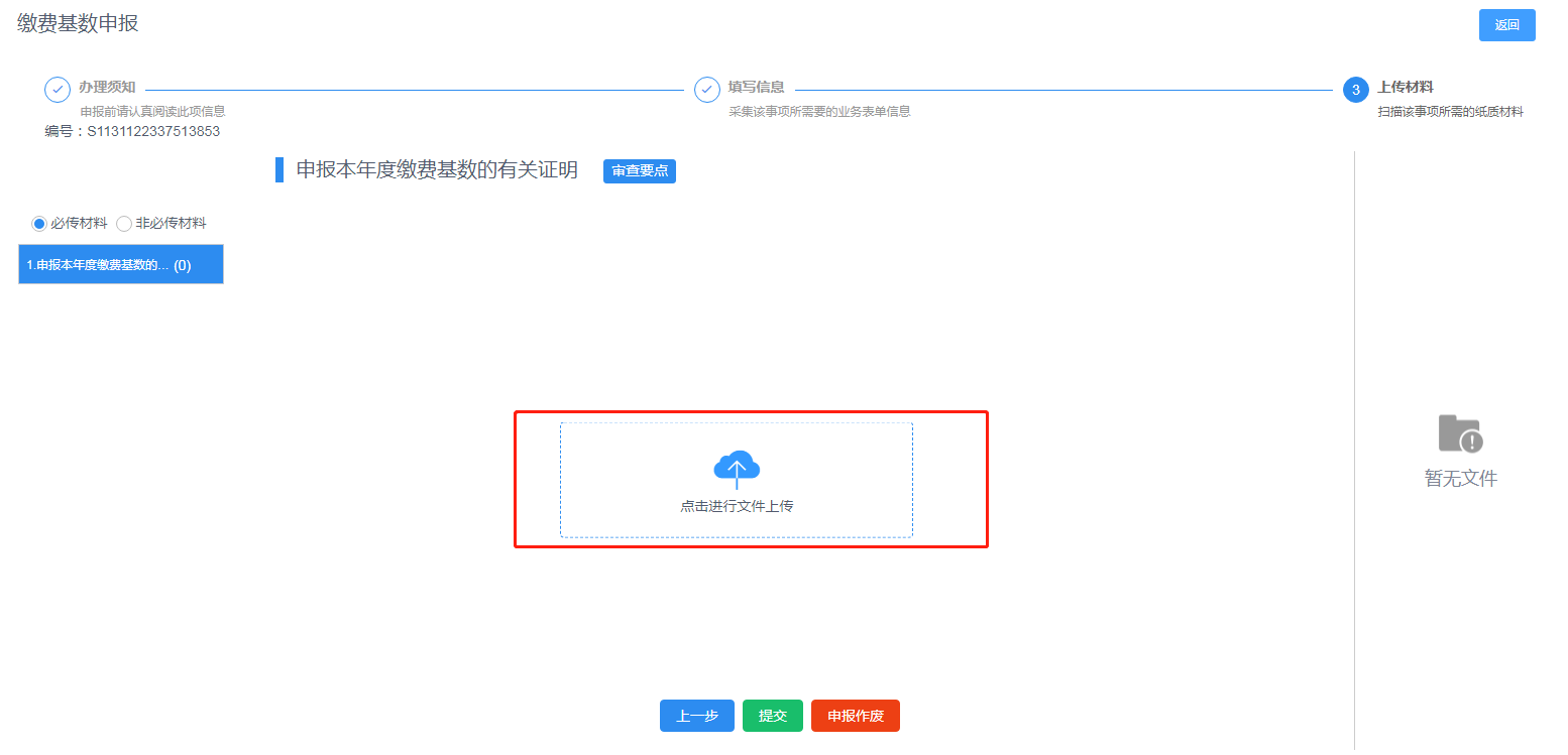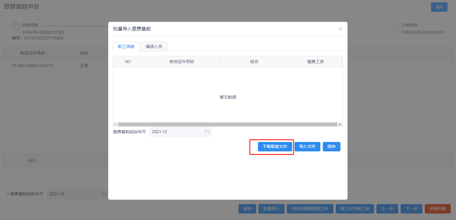 ??????4.點擊“批量導入”,下載報盤文件,批量錄入職工繳費基數后,導入文件,保存,或著手工錄入繳費基數,保存,點擊“下一步”。