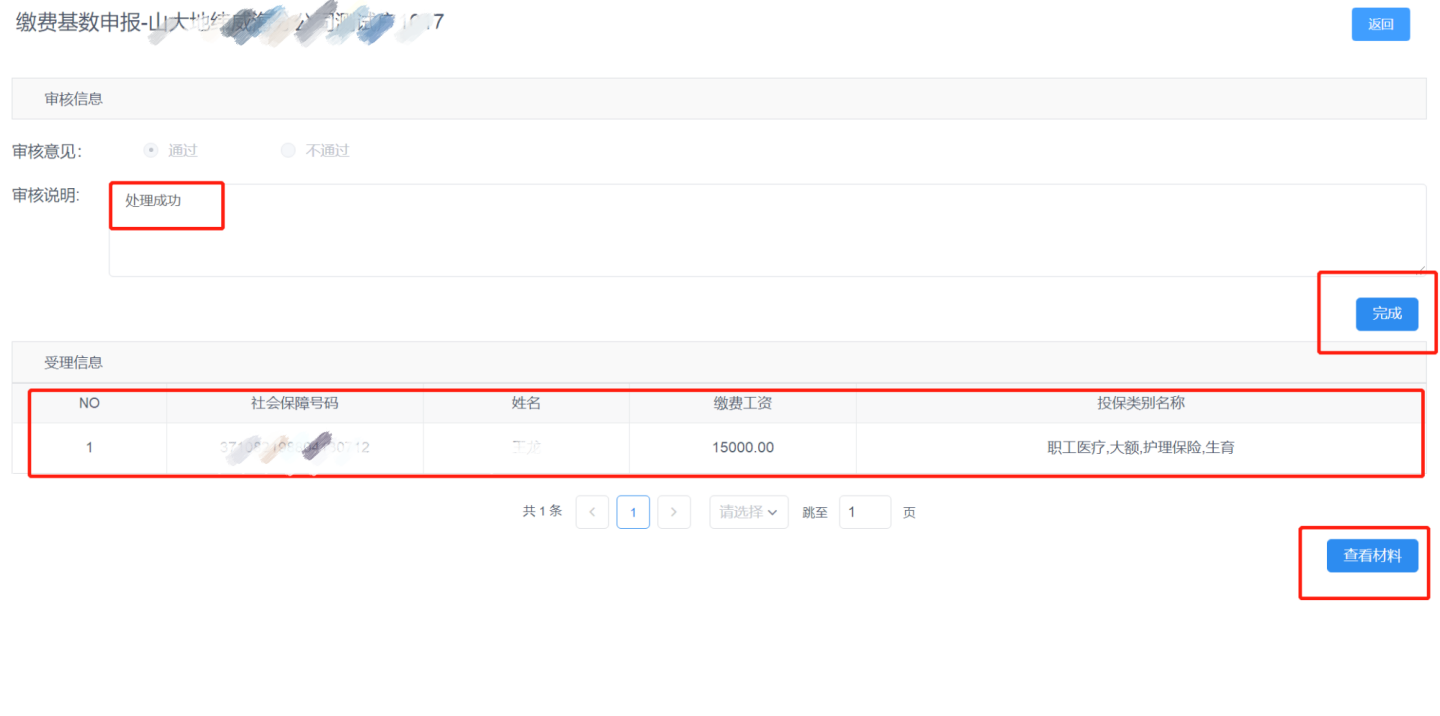 ??????8.提交后,企業即可查看審核結果,核對受理信息姓名、繳費工資準確無誤后,點擊“完成”。