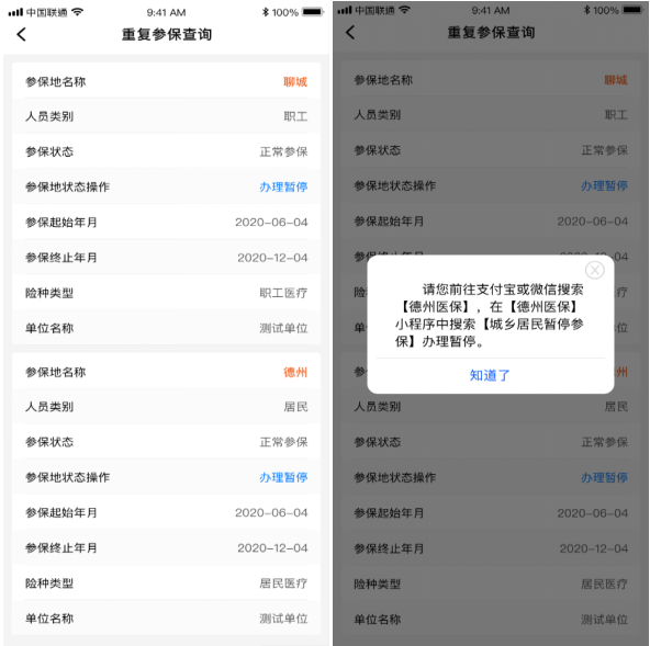??????如果參保人員未重復(fù)參保,提示截止目前,沒(méi)有查詢(xún)到你在山東省內(nèi)重復(fù)參保信息。如果參保人員重復(fù)參保,會(huì)出現(xiàn)下面重復(fù)參保查詢(xún)界面。
