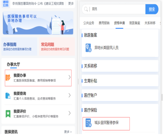 ??????(二)如果您重復(fù)參保查詢(xún)的人員類(lèi)別是“居民”,參保人員可通過(guò)微信或支付寶搜索戶(hù)籍地所在地市醫(yī)保小程序(比如您的戶(hù)籍地是威海,微信或支付寶搜索【威海陽(yáng)光醫(yī)保】小程序),登錄小程序,首頁(yè)找到【我要辦事】,點(diǎn)擊【城鄉(xiāng)居民暫停參保】,按提示要求辦理即可。