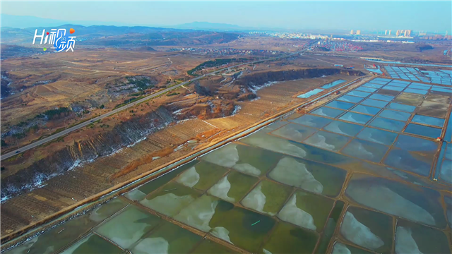 ??????冬日,俯瞰榮成市港西鎮,冰封的鹽田整齊排列,映襯著天際,仿佛一塊塊平整清亮的鏡面,美麗如面,呈現出色彩斑斕的獨特風景。