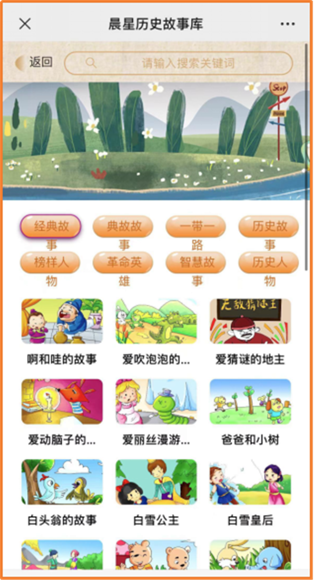 ????故事庫包括8個模塊:經典故事、典故故事、一帶一路、歷史故事、榜樣人物、革命英雄、智慧故事、歷史人物。