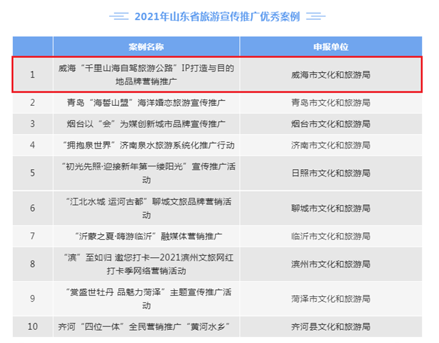 ??????4月12日,山東省文化和旅游廳發布《關于公布2021年山東省旅游宣傳推廣優秀案例的通知》,“威海‘千里山海自駕旅游公路’IP打造與目的地品牌營銷推廣”案例以全省第一名的成績,入選2021年山東省旅游宣傳推廣十大優秀案例。