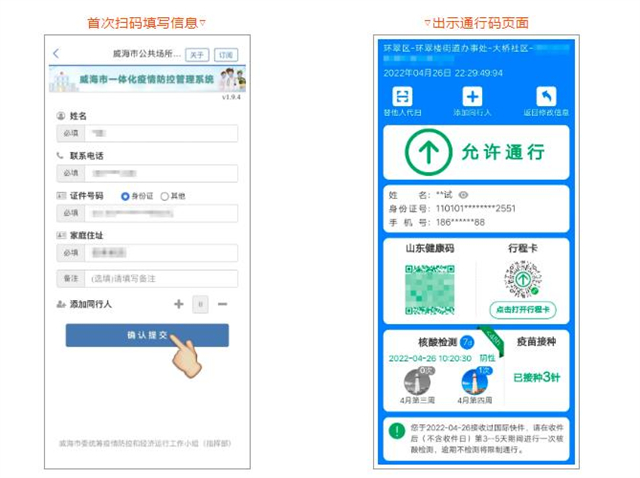 ??????初次掃碼使用時,需填寫個人信息并提交,之后使用僅需掃碼即可,系統將自動登記提交并彈出通行碼頁面,如未自動跳轉結果頁,手動點擊【確認提交】按鈕即可。