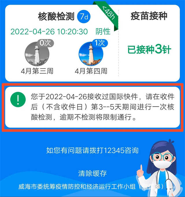 ??????若近期您接收到國際快件,也會在頁面中提示您要在規定時間內進行核酸檢測。