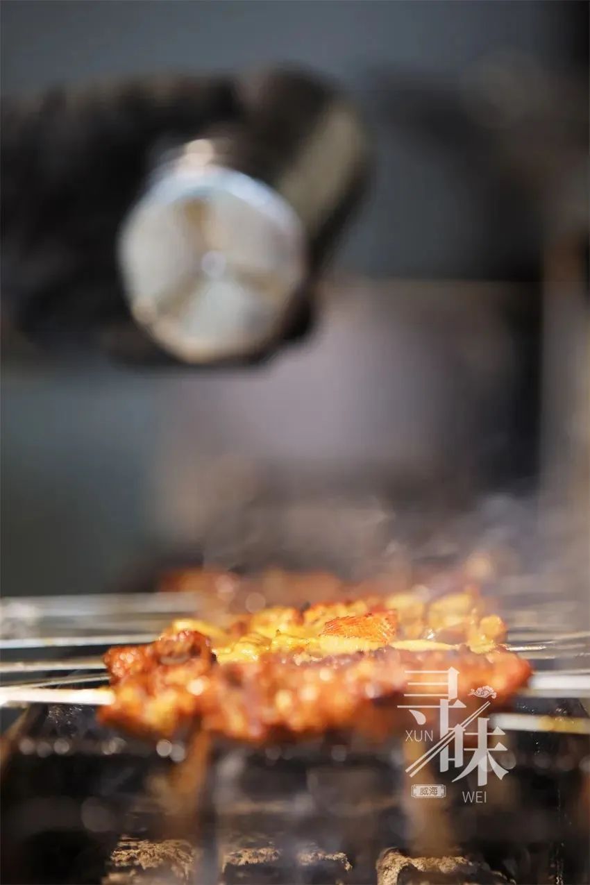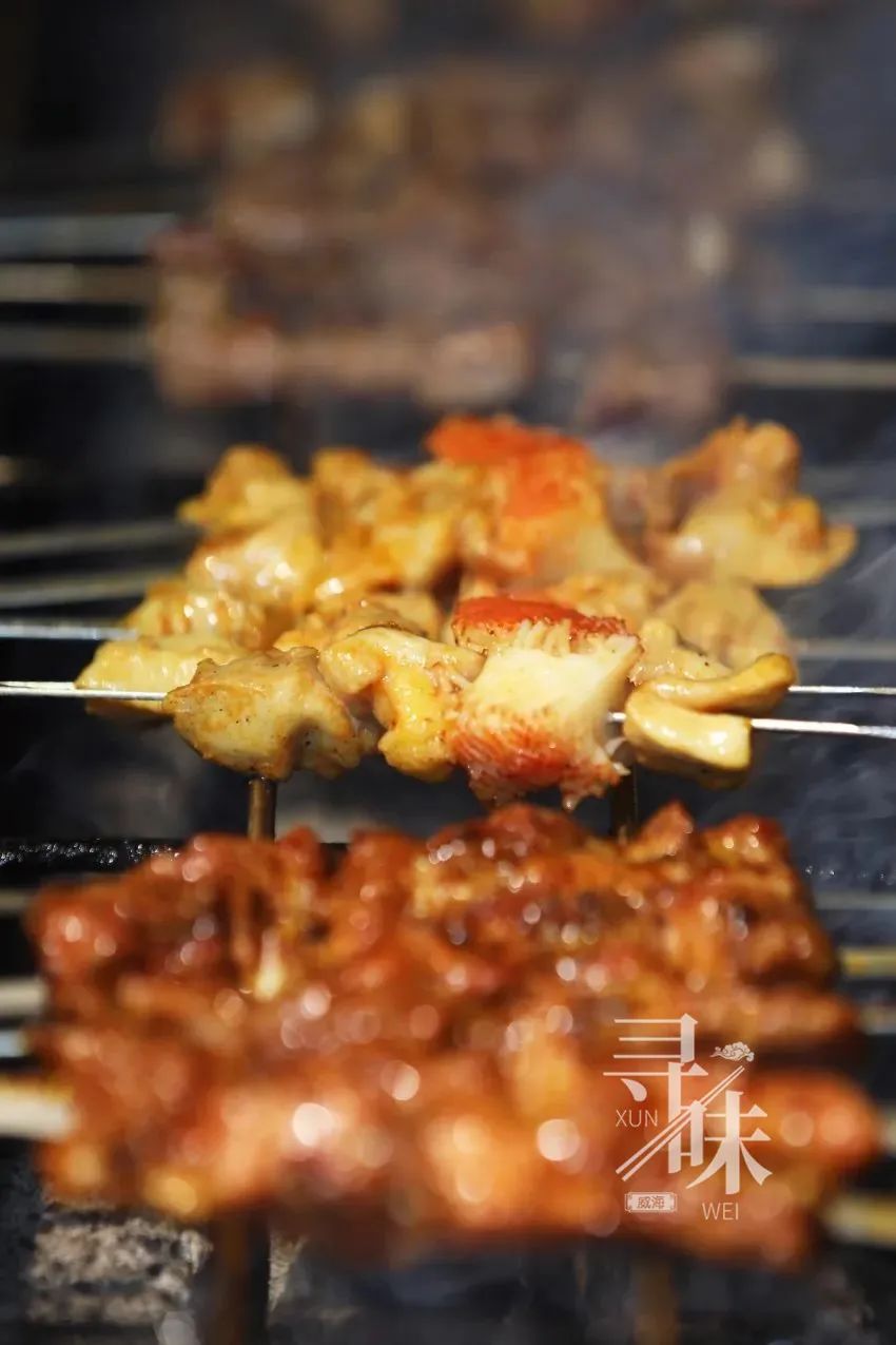 老沈陽烤雞架、黃金大板筋、嫩雞烤蟹肉、炭烤護心肉、迷迭香掌中寶、特色烤鵪鶉、椰漿烤面包、膠東特色烤鲅魚……甭管地上跑的、海里游的,穿上簽子皆可成為“胃中之物”。