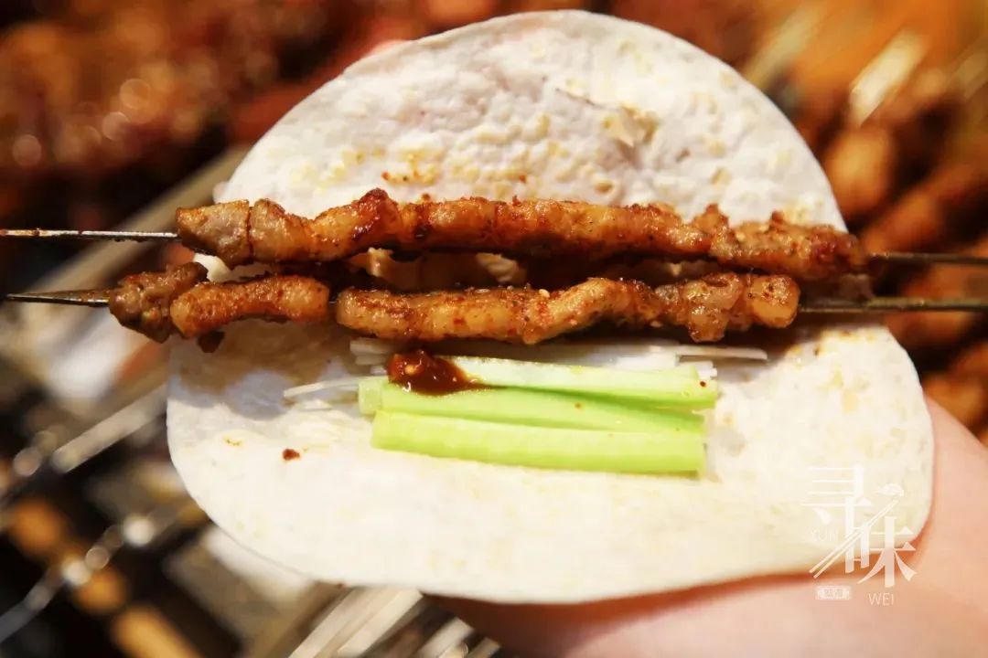 在包容性方面,餅與燒烤有著異曲同工之妙,萬物皆可包。香噴噴的五花肉串放在餅皮,搭配好蔬菜和醬料,握住餅皮使勁擼下燒烤簽,送到嘴邊,大快朵頤,這是燒烤的進階版吃法。