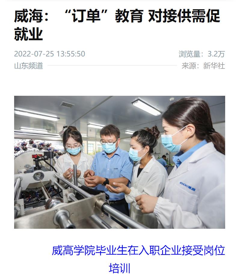 ??????7月25日,新華社以《威海:“訂單”教育 對接供需促就業》為題,聚焦威海企業與高校建立的人才共育機制,以下為報道全文: