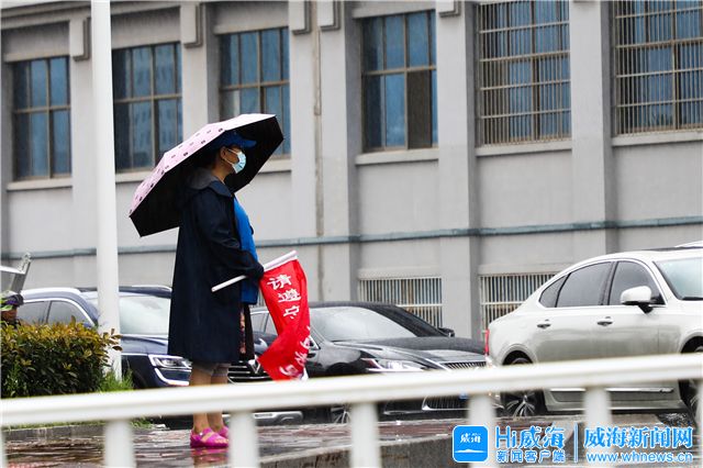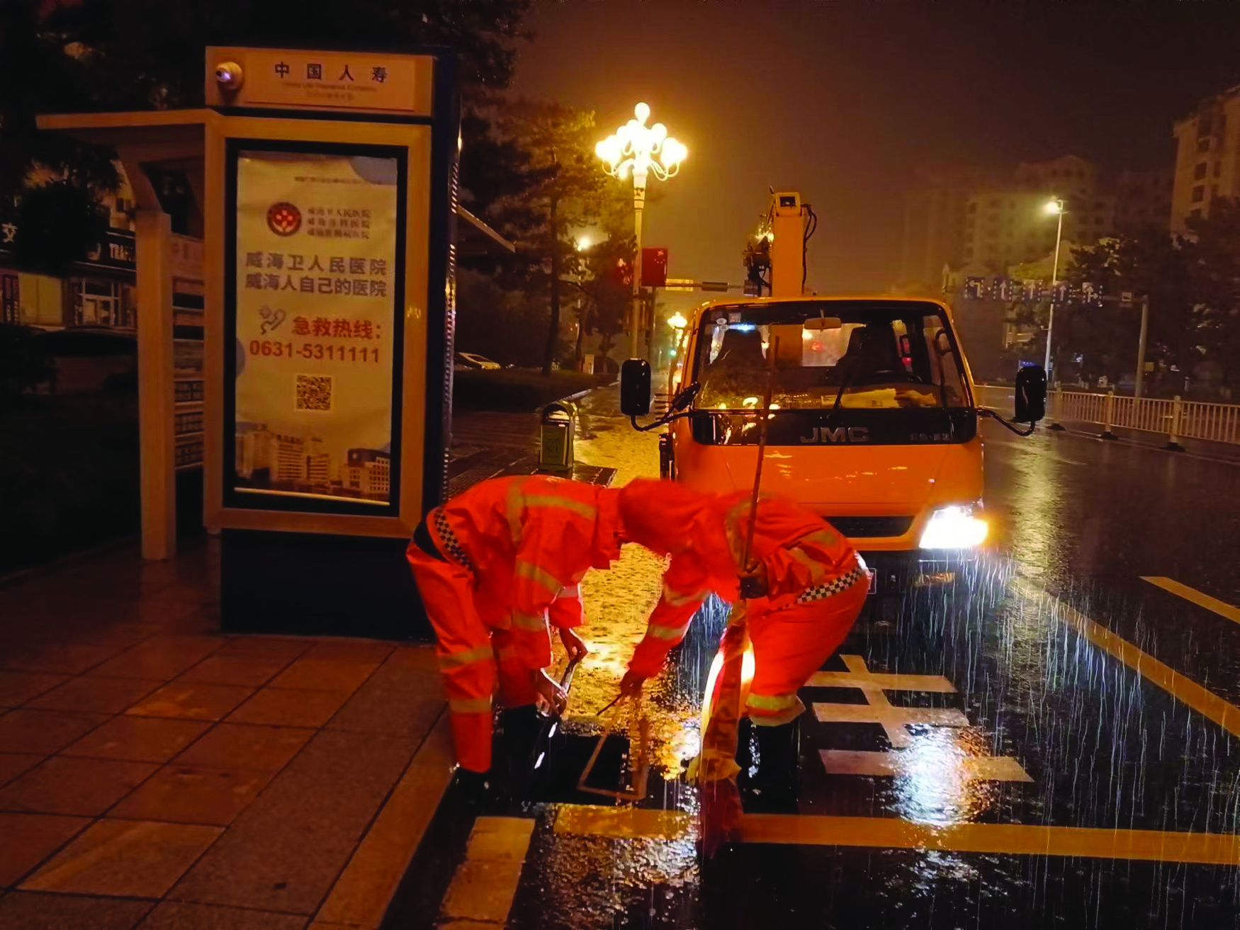 ??????在市區海濱路一處公交站點旁,環翠區市政園林服務中心的兩名身穿橙色雨衣的防汛人員,正合力抬起一個雨水箅子,將警示用的彩旗插在了三腳架上。雨不停,他們便一直在路上,打開雨水箅子、清理路面雜物、開車沿路巡查,這些工作,他們早已熟悉無比。