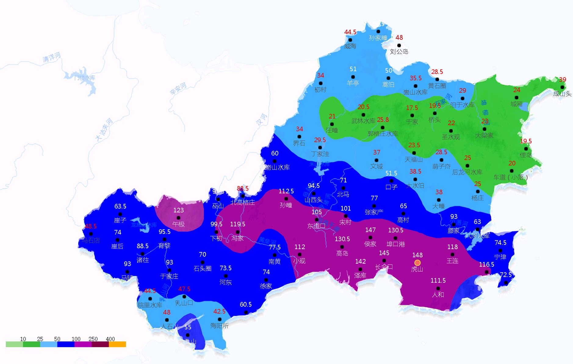 ????8月13日3時至12時,全市平均降水量59.7(單位:mm,下同),環翠區36.8,文登區75.0,榮成市54.3,乳山市76.3,高新區39.9,經開區32.5,臨港區22.4,南海新區120.2。最大降水量站點榮成市虎山148.0。