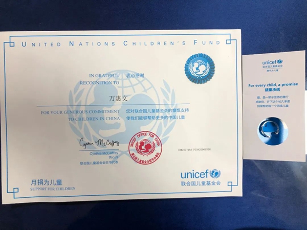 圖片萬惠文同志生前向聯合國兒童基金會捐款的證書