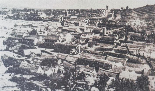 ??????日軍占領石島后,①為姜家牌坊,②為偽榮成縣公署,③為日海軍炮樓。