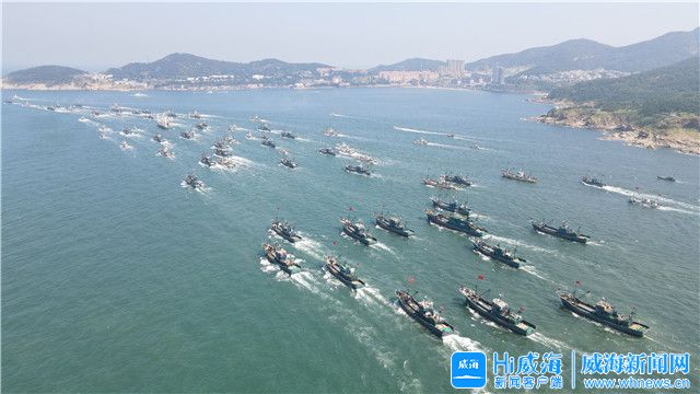 ??????中午12時,威海正式開海!威海中心漁港離的漁船魚貫而出,一條接一條駛離碼頭,奔向廣闊的大海,場面十分壯觀。