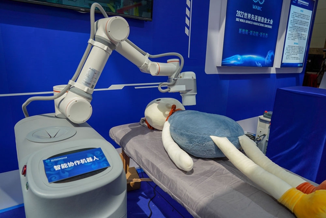 圖為紐氏達(dá)特機(jī)器人系統(tǒng)技術(shù)有限公司在2022世界先進(jìn)制造業(yè)大會上展示的智能協(xié)作機(jī)器人正在模擬艾灸。新華社記者朱崢 攝