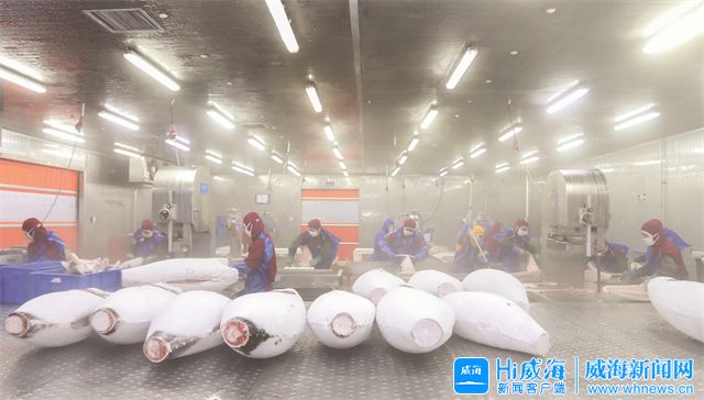 ??????威海新聞網訊 在山東鑫發漁業集團有限公司藍潤金槍魚加工基地內,解凍后的金槍魚被去皮、剔骨、刨肉,加工成產品,通過冷鏈物流,它們將被端上世界30多個國家和地區的餐桌。