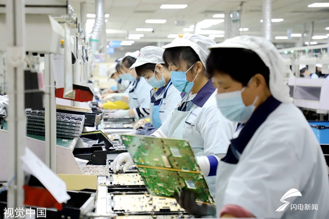 圖/11月3日,青島西海岸新區(qū)一家高科技電子產(chǎn)品出口企業(yè)車(chē)間內(nèi),工人在生產(chǎn)線上加工電子配件完成出口訂單。