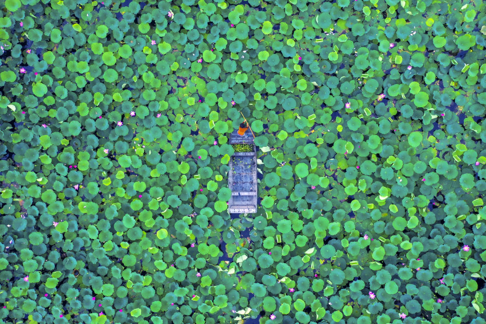 ??????↑漁民在山東省濟寧市微山湖濕地采荷。